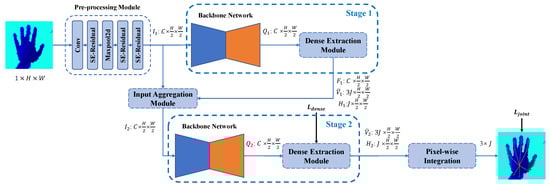 The working pipeline of the proposed SARN is shown in Figure 2. SARN is a two-stage model, which consists of a pre-processing module, an input aggregation module, two backbone networks, two dense extraction modules, and a pixel-wise integration module. Each stage of SARN consists of a backbone network and a dense extraction module. Both stages extract a dense representation of the spatial relationships between pixels and hand keypoints in the world coordinate frame. The input aggregation module extracts feature maps from the first stage and transfers them into the second stage to connect the two stages. The pixel-wise integration module takes the dense representation output from the second stage to infer the 3D position of each hand keypoint. We implement supervision on both the dense representation of the second stage and the hand keypoint position. Each part is described in detail in the following sections.