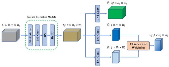Figure 3 shows the components of the dense extraction module at the i-th stage. A dense extraction module consists of a feature extraction module, three parallel Conv layers, and a channel-wise weighting layer. The dense extraction module uses the feature maps output by the backbone network at the same stage to predict a dense representation of spatial relationships between pixels and hand keypoints, which consists of a 3D offset map and a characteristic shifted attention heatmap.