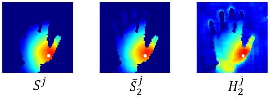 where represents the 3D offset pointing from hand keypoint j to pixel , denotes the position of a pixel in the world coordinate frame, and denotes the ground-truth position of hand keypoint j. stands for the radius of a sphere that is centered at the position of keypoint j to indicate the space where candidate supporting points are located. Those candidate supporting points are spatially close pixels of keypoint j. If is not a supporting point of keypoint j, that is, if the Euclidean distance between pixel and keypoint j is larger than , the 3D offset between them will be set to zero. The 3D offset map can be further decomposed into a spatial closeness heatmap of size and a directional unit vector map of size . This decomposition is achieved by decomposing each 3D offset in into a spatial closeness and a directional unit vector, as follows: