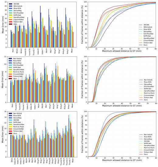 Figure 10 shows the per-keypoint and all-keypoint mean error (left column) and success rate (right column). Table 2 summarizes the performance of state-of-the-art methods by the all-keypoint mean error in millimeters. The result indicates that the proposed method outperforms all state-of-the-art methods on the NYU dataset and achieves state-of-the-art performance on the ICVL dataset and MSRA dataset with an all-keypoint mean error of 7.32 mm, 5.91 mm, and 7.17 mm, respectively.