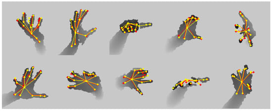 Hand pose estimation (HPE) is an important research topic that is widely studied and applied in many fields, including augmented reality (AR) and virtual reality (VR) [1], human-computer interactions (HCI) [2], robotics [3], and medicine [4,5,6,7,8,9,10,11]. HPE is usually achieved by predicting the positions of a group of hand keypoints that determine the pose of the hand, such as the finger joint center and center of the palm. In medicine, HPE is essential to recognizing hand movement [7,12] and in rehabilitating hand functions [5,8]. It can provide clinicians and physical therapists with accurate estimates of hand movement in different hand tests while maintaining inter-observer reliability [7]. Traditional HPE methods track hand movements using wearable sensors [4,5,6]. Sensor-based methods can track hand positions accurately, but the size and mass of the sensors may interfere with the movement of the hand, leading to measurement errors [7]. Moreover, because of the specifics of the sensors and their calibration, sensor-based methods become limited to specific testing environments.