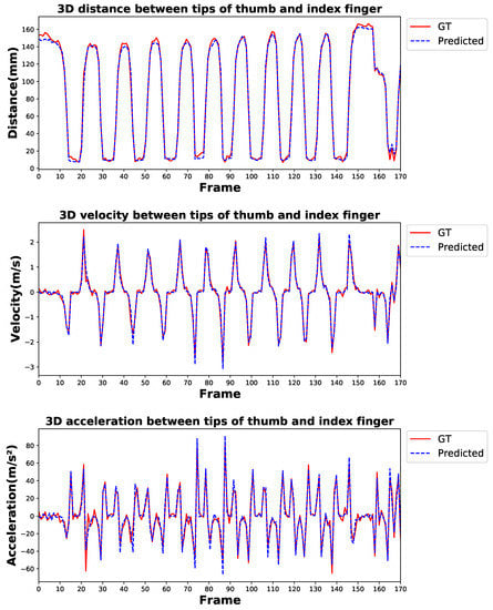 The results indicate that the proposed method performs well in predicting hand keypoint position with a 2.99 mm all-keypoint mean error while also achieving comparable performance in estimating the distance, velocity, and acceleration of the relative movement between the two fingertips. Figure 12 shows the qualitative result comparison between the ground truth and predicted distance, velocity, and acceleration of the movement during a trial of the finger tapping test, which can serve as an intuitive reflection of the performance of the proposed method.