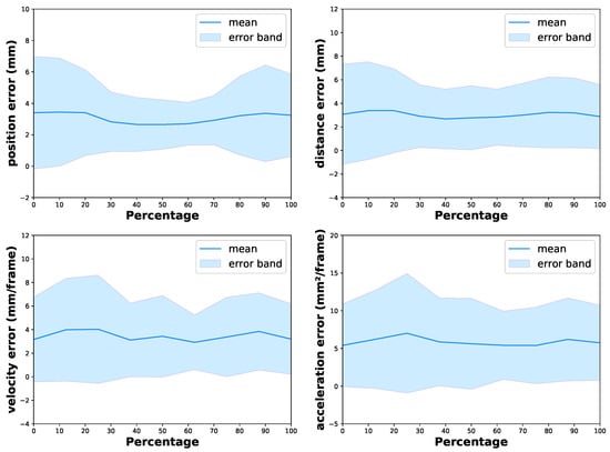 Moreover, we also analyzed the variation in the performance of the proposed method with respect to different moving states. Specifically, the resting time between trials was removed, and the frames of each tapping in each trial were labeled as percentages from 0 to 100 proportionally, with 0 denoting the beginning of the opening phase, 50 denoting the end of the opening phase, which is also the beginning of the closing phase, and 100 denoting the end of the closing phase. For example, in Figure 9b, frames one to four are 0% → 50%, and frames four to seven are 50% → 100%. Then, we calculated the errors of SARN at different percentages, and the results are shown in Figure 13. For all the evaluation metrics, our model achieves comparable and reasonable error and standard deviation across the whole movement, which indicates that our model is accurate and stable during the entire test. At the beginning and end of the tapping, the position error is slightly larger than those in the middle; this may be attributed to the severe self-occlusion on the fingertips when the two fingers are close to each other, as shown in the first and last frame in Figure 9b.