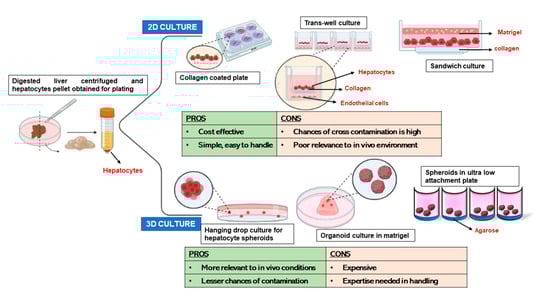 Various methods of 2D and 3D culture of hepatocytes. 2D methods include conventional collagen-coated plates, trans-well and sandwich culture and 3D culture methods include hanging drop culture, organoid culture and spheroid culture. Advantages and disadvantages of each method provided. Original images by authors created with Biorender.com (accessed on 20 October 2022).