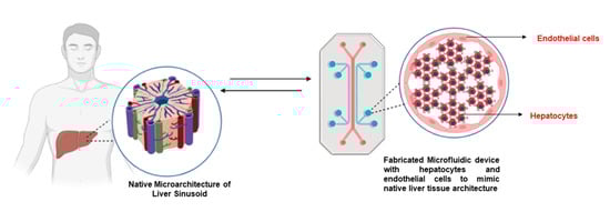 Schematic representation of a liver-on-chip device to mimic the native liver tissue microarchitecture. Original images by authors created with Biorender.com (accessed on 20 October 2022).