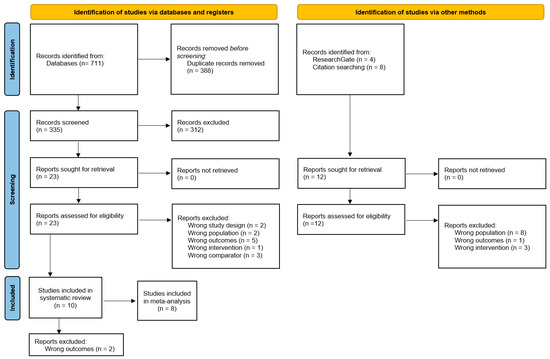 The literature search resulted in the finding of 723 studies. Among these records, 711 were obtained from Medline (PubMed), WOS, EMBASE, Science Direct, Sportdiscus, and Scopus and 12 from additional sources such as ResearchGate and reference lists of relevant studies. After the exclusion of 388 duplicates, a total of 335 articles were examined. Of these 335 articles, 312 were excluded for different reasons: 215 after analysis of titles and/or abstracts, 41 studies for being an inappropriate document type, and 56 articles for being unrelated to refrigeration and exercise. Twenty-three articles were considered as potential records, which underwent further full-text evaluation. Finally, a total of 10 studies were included in the qualitative synthesis (systematic review) [5,6,18,19,20,21,22,23,24,25] and eight studies for the quantitative synthesis (meta-analysis) [5,6,19,20,22,23,24,25] (Figure 1).