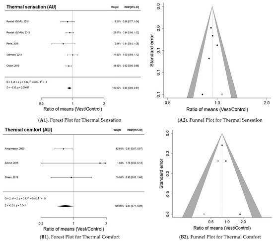 Figure 2 shows the effect of using the CVs on the perceptual response. With respect to ThS (Figure 2(A1)), a statistically significant reduction effect is produced (p < 0.05): ROM 0.93; 95% CI, 0.89–0.972; Z = −3.30; p = 9.7×10-04 for the studies [6,19,20,23] analyzed in the meta-analysis. The publication bias analysis (Figure 2(A2)) for wind chill presented a relatively symmetric funnel plot, with one study being imputed that could indicate the presence of publication bias, although this asymmetry was not statistically significant (Egger p-value = 0.628).
