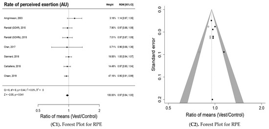 In the included studies [6,20,22,23,24,25], decreases in RPE with statistically significant changes (p < 0.05) are observed: ROM 0.97; 95% CI, 0.94–1.0; Z = −2.05; p = 0.041 (Figure 2(C1)). Only one study [22] showed a slight increase in athletes with a relatively low weight (3.18%) over the meta-analysis as a whole. In this analysis, no publication bias was detected by Egger’s regression (p-value = 0.170); through the Trim and fill method, three studies were imputed at levels higher than ES and low standard error, which could indicate a possible lack of studies at this level (Figure 2(C2)).