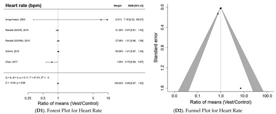Figure 3(D1) indicates that the use of CVs has a non-significant (p > 0.05) minimal reduction effect (ROM 0.99; 95% CI 0.97–1.02; Z = −0.40; p = 0.69) on HR. Arngrimsson et al. [22] showed a significant increase (p < 0.05) in HR but presented great heterogeneity with a wide 95% confidence interval (0.32–160.07) and practically no weight (0.01%) in the meta-analysis. In this analysis, no publication bias was detected by Egger regression (p-value = 0.5339); through the Trim and fill method, there was no imputation of studies at levels higher than ES and low standard error (Figure 3(D2)).