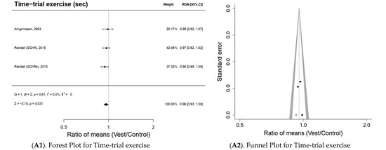 Figure 4(A1) shows that the use of CVs produces a significant decrease (p < 0.05) in time-trial exercise ROM 0.96; 95% CI 0.93–1.00; Z = −2.15; p = 0.031. The studies analyzed [22,23] show improvements in performance with decreases in time-trial exercise. In this analysis, no publication bias was detected by Egger’s regression (p-value = 0.5269); however, through the Trim and fill method, there was an imputation of one study at levels higher than ES and low standard error, which could indicate a possible lack of studies at this level (Figure 4(A2)).