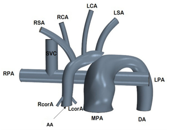 The 3-dimensional baseline synthetic HCSII geometry was modeled using SolidWorks (Dassault Systemes, Concord, MA, USA), which includes the MPA, ascending aorta (AA), the descending aorta (DA), right and left subclavian arteries (RSA, LSA), right and left carotid arteries (RCA, LCA), right and left coronary arteries (RcorA, LcorA), and the BDG procedure with SVC connected to the RPA and LPA as shown in Figure 2. The in-silico model was developed based on the averaged dimensions obtained from the deidentified angiographic images of three patients provided by our clinical collaborators at Arnold Palmer Hospital (APH) for children.