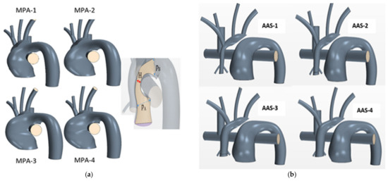Patient generic synthetic geometries for varying (a) MPA narrowing denoted as H, and (b) ascending aorta root diameters ().