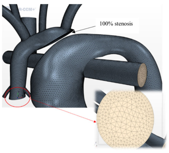 The geometries were imported into the destination CFD software STAR-CCM+ (Siemens, Munich, German). A high-quality finite volume mesh was generated following a grid independence study using tetrahedral elements [35], with a base size of 0.3 mm and three prism layers at the wall boundary (Figure 4). The nominal HCSII geometry was modeled with 100% stenosis to replicate the complete obstruction of the distal arch. The number of cells varied between 1.5 million and 2.3 million across all geometries modeled.