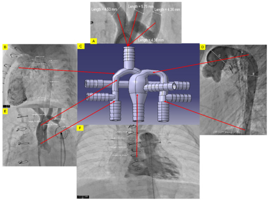 Development of a 3D CAD model of the HCSII centerpiece from deidentified angiographic images (A). Diameter of RCA, RSA, LCA, and LSA (B). Diameter of MPA root (C). Dimension of the 3D phantom with the labeled diameters (in mm) of labeled branches using CATIAv.5 (D). Diameters of the aortic arch and descending aorta (E). Diameter of AA (F). Diameter of MPA.