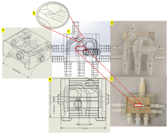 (A). Side view of the top half, (B). Anterior view of the centerpiece with rails (C). Bottom half of the centerpiece with stent and gasket. Interior view of the centerpiece with rails, (D). 3D phantom with the labeled conduits (E). Completely stenosed section in the HCSII anatomy. (F). HCSII centerpiece within the rectangular block.