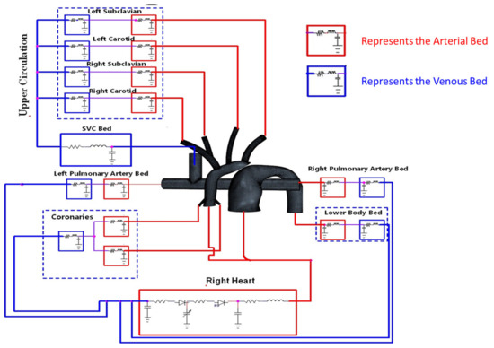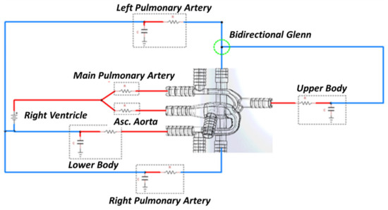 A complex circulatory system can be modeled using an electric analog circuit known as LPM. The LPM was tailored to replicate the peripheral circulation of the patient’s anatomy and tuned to closely match the catheter data. The HCSII circulation was compartmentalized in a series of arterial and venous elements that include resistors, capacitors, and inductors as discussed in [23,29]. The LPM-generated waveforms used as boundary conditions (BCs) to drive the CFD model. The model consists of three main subsystems: the upper circulation, the lower circulation, and the pulmonary circulation, as shown in Figure 7. The RV powers the LPM circuit utilizing a time-varying capacitor regulated by the elastance function [41,42], which is defined as