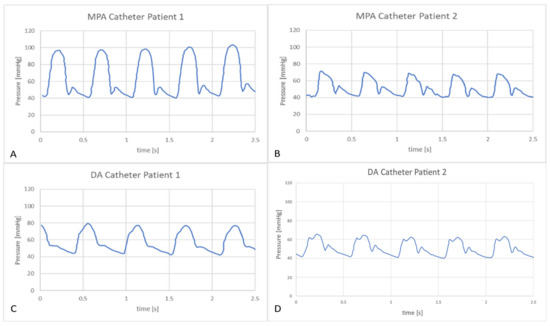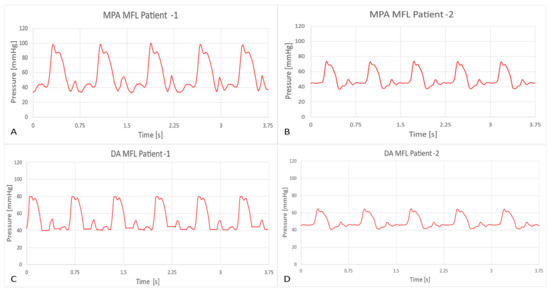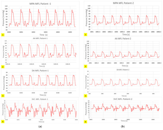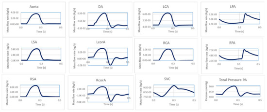 Figure 8 shows a sample set of BC waveforms that were applied to the CFD model following the LPM tuning. Each outlet was treated as a mass flow outlet, while the aortic root was considered as a mass flow inlet, and a total pressure was imposed at the MPA.