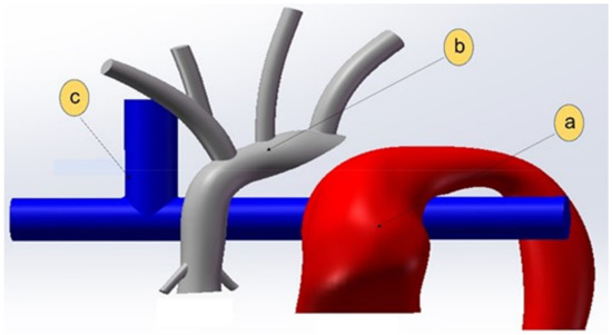 The fluid domain in Figure 11 depicts a 100% stenosis as a result of the complete obstruction of the distal arch. For simplicity, the fluid domain has been split into three separate regions, (a) the systemic flow originating from the pulmonary root to the lower body, (b) the systemic flow originating in the aortic root to the upper body, and (c) the SVC flow to the PA as shown in Figure 11.