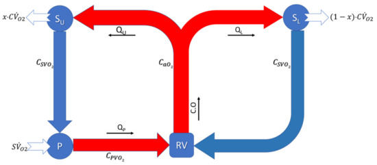 Equations (8)–(10) describe the systemic (S.U. and S.L.) and pulmonary (P) oxygen equilibrium. Equation (8) shows that the oxygen flow rate in the upper systemic circulation ( is reduced by the oxygen consumption of the upper body () leaving the reduced oxygen flow rate returning to the PA through SVC, where is the systemic oxygen content of the venous flow.