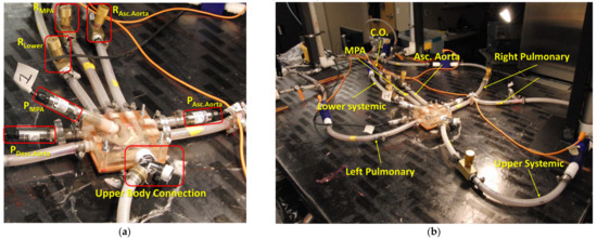 The MFL was modeled to resemble the physiological anatomy of a patient with 0.34 m2 BSA. In this MFL setup, the lumped compartments representing the peripheral circulations of the patient were connected to the 3-D phantom of the HCSII geometry. The MFL consists of four compartments, and each compartment was developed with two elements (i.e., resistance and compliance) Windkessel models. Four compartments represent upper systemic, lower systemic, right, and left pulmonary circulations, as shown in Figure 9. Each lump represents the arterial and venous vasculature found within the physiological anatomy. The voltage source represents the RV. The detailed design and fabrication procedure for the MFL setup have been detailed in our previous studies [31,32].