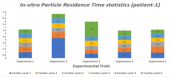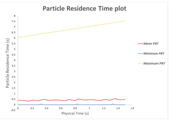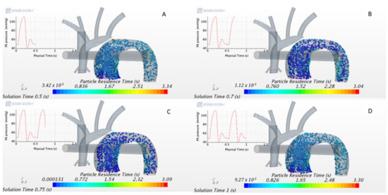 Particle residence time (PRT) can help identify the presence of regions of recirculation, stagnation, or otherwise poor flow that can increase the risk of thrombus formation. Higher residence time in a specific region may cause platelets to accumulate shear stress and become activated [53,54,55,56,57]. PRT was calculated by releasing massless particles into the domain and tracking their residence time. Reininger et al. [53] calculated residence time to determine the effect of shear stress and residence time on fibrin clot formation in a laminar and turbulent flow. The study found that residence time is more critical for clot formation than the shear rate [57]. In similar studies, PRT calculations were different between patients and demonstrated the importance of PRT in identifying the recirculation and stagnation zones [55].