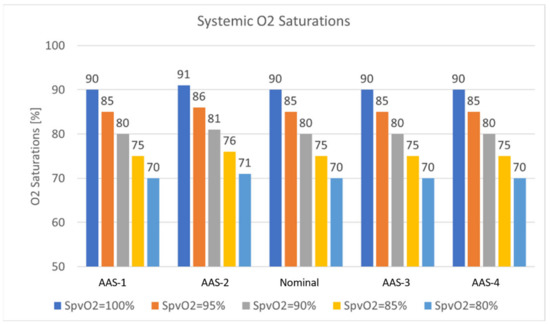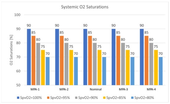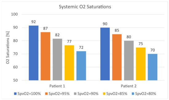 Oxygen consumption has been determined based on literature-derived per-weight oxygen consumption 9 (mL/s)/Kg. The above expressions require cycle-average flow rate inputs originating from in-silico and in-vitro measurements (CO, Qs, and Qp), as well as literature-derived blood oxygen capacity and oxygen consumption data [31]. Pulmonary venous oxygen concentration was calculated from an assumed oxygen saturation (100, 95, 90, 85, and 80%) depending on patient ventilation and a given oxygen capacity (0.22 mL O2/mL of Blood). The oxygen saturation anywhere in the model can then be computed as .