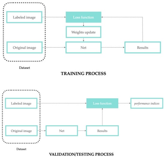 In supervised learning, network training is the process where the segmented images, as the net output, are compared with a group of labeled images, as the net input, until the convergence between input and output is obtained (as error reduction). In other words, supervision means that each input image is coupled with a label, and this association is learned from the network to predict a specific output. During the learning process, the network weights are updated to reduce the error between the experts’ annotation (ground truth/labeled images) and the network prediction. This error is then evaluated and quantified through validation and testing processes. According to the concepts discussed in the previous sections regarding data labeling and weights update, Figure 3 reports a more detailed representation of the training/validation/testing process.