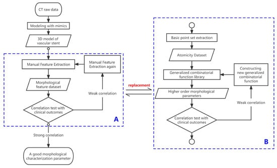 Block diagram of traditional and novel processes for measuring morphological parameters. The left half of the image shows the process of analyzing morphological parameters using traditional method. The novel method in this section shown in dashed box (B) replaces the traditional process shown in dashed box (A).