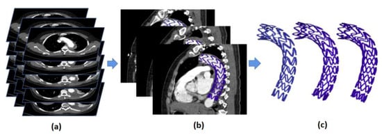 The detailed CTA images of all patients with TBAD who underwent TEVAR at the West China Hospital, Sichuan University, between December 2011 and October 2018 were collected. We excluded non-imagable CTA [24,25] because, under the influence of the nonuniformly distributed contrast media, the stents become blurred and incomplete. Cases with missing patient information data were also excluded because these could not be classified accurately and the follow-up time could not be calculated. Finally, this study included 26 patients (Appendix A Table A1) with a 3-year follow-up period (Appendix A Figure A1).