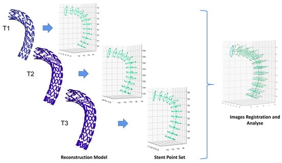 Visualization and registration of stent points. (T1, T2 and T3 denote models at 3, 6 and 12 months, respectively).