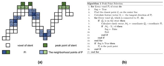 Next, we calculated the center of gravity of each ring and obtained the center line of the stent by the cubic spline interpolation. The peak point on the stent was calculated through the center line and the stent voxel model. The pseudo-code and schematic diagram of the algorithm are shown in Figure 4.