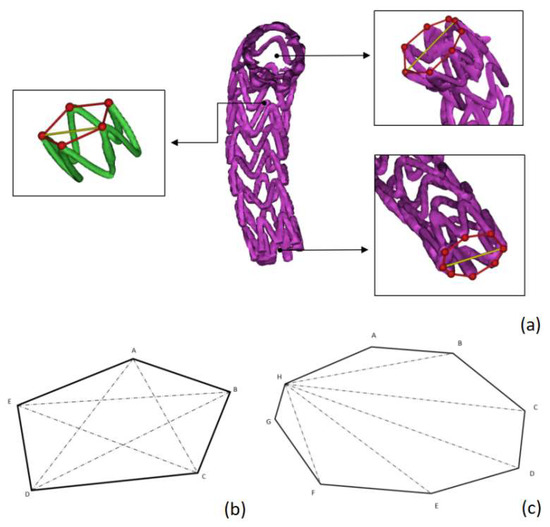 Schematic diagram of stent characteristic diameter: (a) the red line marks the shape of the outer connection of each ring of the stent, and the yellow line marks the selection point of the characteristic diameter of the ring; (b) the line of the selection of the characteristic diameter of the five-point ring; (c) the line of the selection of the characteristic diameter of the eight-point ring during the traversal of the H-point.