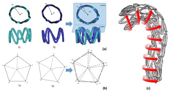 Figure 7 shows the sequentially numbered stent rings from 1 to M from the proximal to the distal end. The coordinates of the relative positions of the M stent ring point_mid are calculated. The data of the stent ring numbered k(1 ≤ k ≤ M) in the two follow-up periods of T1 (Figure 7a(T1)) and T2 (Figure 7a(T2)) were taken as an example. First, the vector map (Figure 7b) was obtained by overlapping the calibration of the point_mid of the two periods. Notably, the five points of ABCDE are not necessarily strictly in the same spatial plane β in the actual calculation process. We used the vector Ok+1Ok consisting of the midpoints of the stent ring numbered k and k + 1 as an approximation to the vertical plane vector of the spatial plane β. The magnitude of the projection angle of ∠ PjOPj′ on the plane β is calculated in the vector diagram as the magnitude of the deflection angle of point Pj (1 ≤ j ≤ N), and the average value of the deflection angle of all peak points of this support ring is taken as the magnitude of the deflection angle of the ring (Figure 7c). Their definitions and relationships are defined in Equation (4).