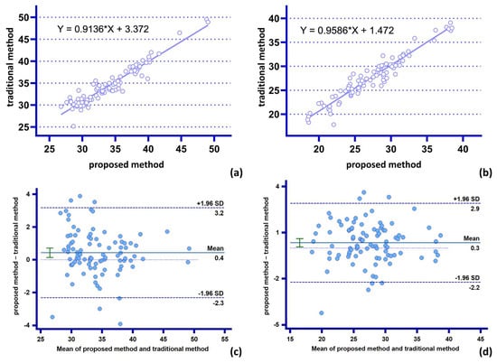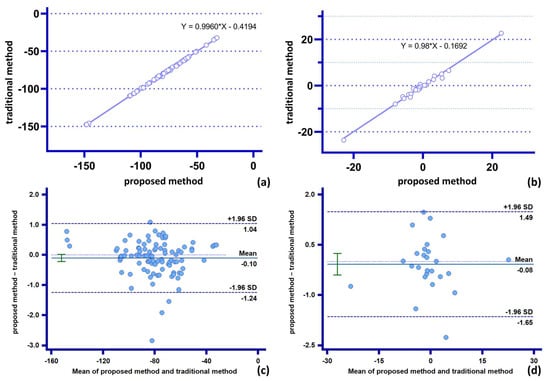 Comparison of agreement between the two methods for the statistics of parameters of moderate complexity: (a,c) measurement and analysis of proximal characteristic diameter of stent for both methods; (b,d) measurement and analysis of distal characteristic diameter of stent for both methods.