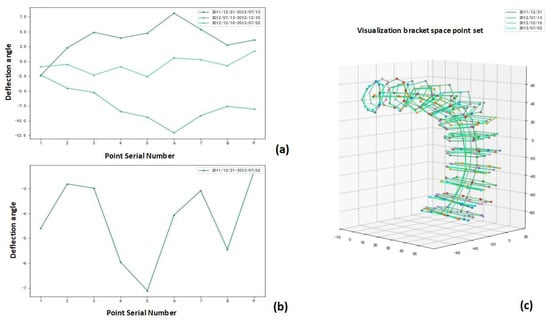Analysis of stent ring deflection angles output by proposed method: (a) distribution of stent ring deflection angles for same patient during four follow-up visits; (b) deflection angles of each stent ring for a patient during the first and last follow-up visits; (c) four periods normalized for patient.