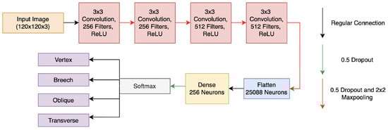 There were seven total layers in Fet-Net. Fet-Net’s feature extraction portion consisted of four convolutional layers, in which there were 2D convolutional filters and a 2D 2 × 2 MaxPooling operation. The first two convolutional layers have 256 3 × 3 filters, whereas the following two have 512 3 × 3 filters. The purpose of the MaxPooling layers was to reduce the dimensionality of the images, which emphasizes the pixels with the essential information. An ascending number of convolutional filters was used in the feature extraction portion of the architecture [32]. ReLu activation functions were in every layer of the architecture to add non-linear properties to the predictive model, as the convolution operation is a linear process. This is a necessary step, as the process of image classification is inherently a non-linear operation [33]. In order to prevent overfitting of the predictive model to the training images, dropout rates of 0.5 were added to each layer of the network. The extracted features were then compiled into one fully connected layer to begin classification. The neural network had three layers: more specifically, a fully connected layer of 25,088 neurons, one hidden dense layer of 256 neurons, and then the final layer had four neurons representing the four labels for classification of fetal orientation. The final classification depended on the neuron with the highest probability based on the softmax function, which was used for multi-class classification.