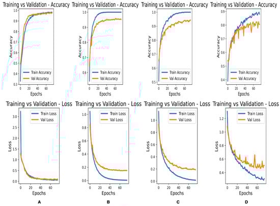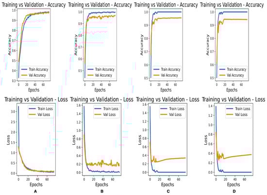Accuracy and Loss curves for training and validation of the second data-fold for various CNN architectures. (A) Complete Fet-Net architecture. (B) No dropout in the feature extraction component. (C) No dropout in the feature extraction component or classification component. (D) No dropout in the feature extraction component or classification component, and no hidden dense layer of 256 neurons.