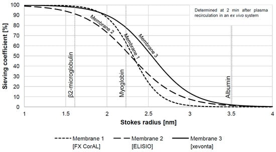 Schematic illustration of sieving coefficients as a function of Stokes radius for three different dialysis membranes. The sieving profiles were determined 2 min after plasma recirculation in an ex vivo system and differ in terms of retention properties across the range of solutes up to the size of albumin. Data were reanalyzed from recently published data [24] (n = 3 for each membrane; membrane 1: FX CorAL [Fresenius Medical Care]; membrane 2: ELISIO [Nipro]; membrane 3: xevonta [B. Braun]).