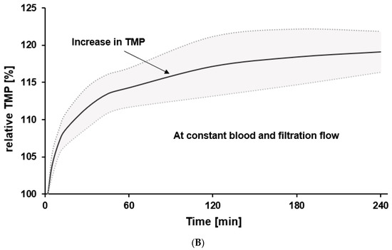 Impact of protein adsorption on the hydraulic characteristics of the membrane. (A) The membrane with strong protein adsorption (left) provides higher mass transfer resistance than the membrane with low protein adsorption (right), leading to a lower filtration flow rate and/or a higher transmembrane pressure (TMP). (B) At constant blood and filtration flows, the build-up of a secondary membrane leads to an increase in the TMP over the treatment time. Data were reanalyzed from a recently published study [24]. The solid line represents the mean value of three different dialyzers (FX CorAL (Fresenius Medical Care), ELISIO (Nipro), and xevonta (B. Braun); n = 3 for each dialyzer type), whereas the dotted line represents the standard deviations. Data were measured at the following time points: 2, 5, 10, 15, 30, 45, 60, 120, 180, and 240 min.