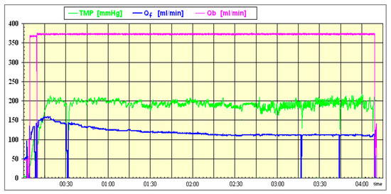 The reduced permeability of the membrane is evident to the machine during the dialyzer stress tests performed during the treatment. As a mitigation for the increased TMP caused by the protein adsorption, the substitution rate is automatically reduced. This effect is particularly conspicuous in the first half an hour after the target stress level has been reached (Figure 4). The reduction in the substitution rate is necessary to keep the treatment stable. Inevitable alarms and treatment interruptions are consequently avoided for nurses and patients. Notably, this reduction in the infusion rates finally leads to smaller substitution volumes. This can be a hindrance to achieving the maximum convective volumes.