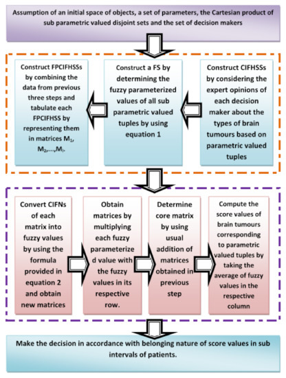 Now, the mode of therapy to choose for effective treatment of the tumour relies on the pathological nature of the tumour, the stage at which it is diagnosed and the tumour category. When diagnosing a patient with a particular disease, medical imaging techniques and the intuition of medical professionals go hand in hand. The diagnostic process is highly reliant on how the medical images are perceived by the medical professionals while considering other symptomatic conditions simultaneously. Medical professionals use computer-aided diagnosis (CAD) to efficiently analyse and classify pathological and imaging data obtained for diagnosing brain tumours [13]. With recent advances in machine learning, data mining and artificial intelligence, these CAD models have come a long way. In the case of brain tumour diagnosis, the accuracy of these models is still sub-par for regular medical use. Researchers are trying to improve the accuracy of these models by processing huge data sets of images and diagnostic test data of brain tumours using deep learning models for improvement in diagnostic accuracy [14,15]. Another approach that is on par with these models is applying fuzzy set theory concepts to design diagnostic support systems. When diagnosing a patient with a particular disease, medical imaging techniques and the intuition of medical professionals go hand in hand. The diagnostic process is highly reliant on how the medical images are perceived by the medical professionals while considering other symptomatic conditions at the same time. So, this diagnostic process presents itself as an MADM (a particular type of MCDM) problem where the medical professional decides, based on the numerous factors of different natures, to come to a tentative decision in the form of a diagnosis. Fuzzy set theory has been extensively used in designing decision support systems as it is considered to handle human intuition using mathematical syntax. The idea was introduced by Zadeh [16]. This theory became the basis of numerous other decision-making studies and led to the development of complex hybrid mathematical structures such as the concept of rough set and period mathematics.