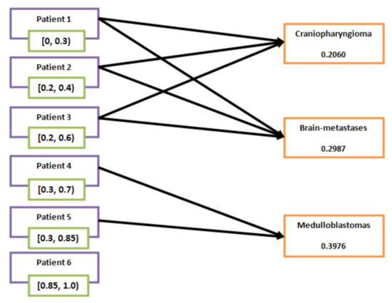 From Table 13, it is clear that , and ; therefore, it is concluded that patients , and are suspected to have brain tumours “craniopharyngioma" and “brain-metastases", whereas patients and are suspected to have “medulloblastomas". Patient is outside the scope of the analysis of susceptibility to these three types of brain tumours. This can also be seen in Figure 8.