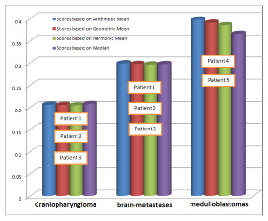 From Table 15, it is clear that and , ; therefore, it is concluded that patients , and are suspected to have brain tumours “craniopharyngioma” and “brain-metastases”, whereas patients and are suspected to have “medulloblastomas”. Patient is outside the scope of the analysis of susceptibility to these three types of brain tumours.