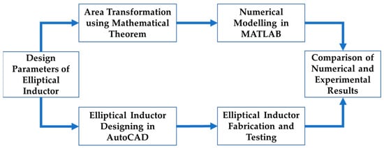 The elliptical planar inductor shape is novel, and there is no existing expression to calculate the inductance and other parasitic parameters. An ellipse can be represented using an equivalent circular shape using the simple area transformation mathematical theorem. Therefore, using this theorem, all the design parameters (inner and outer major and minor diameters) of the elliptical planar inductor can be transformed into the design parameters (inner and outer diameters) of a circular planar inductor. Figure 1 represents the overall research approach, where it can be seen that the proposed numerical model is validated against the experimental results.
