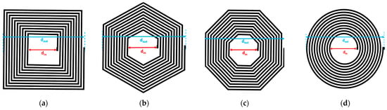 Equation (2) represents the analytical formula to calculate the inductance of symmetrically shaped planar inductors []. Equation (2) is derived explicitly for circular, octagonal, hexagonal, and square-shaped planar inductors [], as shown in Figure 2. In Equation (2), , , and are geometrical constants and their values are given in Table 1 [].