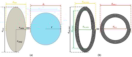 In this paper, an area transformation technique is used to transform the area of an elliptical shape into a circular shape []. In this approach, the inductance of the elliptical planar inductor () is estimated by translating the area of the ellipse ( into the area of the circle by using mathematical transformation formulas []. Using this technique, the design parameters of the elliptical planar inductors are transformed into a circular planar inductor, and all the circular planar inductor formulas can be reused. Figure 3 represents the schematic flow of the transformation of the ellipse area into the area of the circle. Figure 3a shows an ellipse with a minor radius and major radius which can be transformed into a circle with a radius using Equations (3)–(5). Equations (6) and (7) represent the radius ( and diameter of the translated circle.