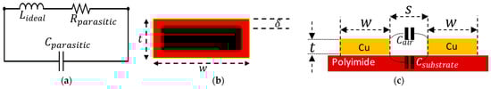 The parasitic capacitance () is one of the significant parasitic components and can limit the functionality of the inductor. The parasitic capacitance for the planar inductors can be computed from Equation (17) [,]. Total parasitic capacitance is a combined effect of capacitances between the nearby metallic traces due to the air gap between traces and underlying substrate material (polyimide).