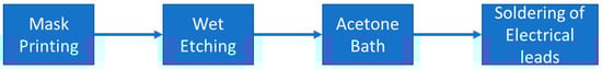 To validate the proposed elliptical inductor model, different elliptical planar inductors were made using a wet-etching method. In the first fabrication stage, a LaserJet printer (HPM553, HP Technology, Dublin, Ireland) was used to print the inductor mask directly onto a 50 thick single-sided copper-coated polyimide film (Flexible Isolating Circuit 50 Microns-Coppered 35 Microns-1 Side, CIF, Buc, France). As the next step, these copper-coated polyimide films with printed masks were attached to the plastic stand of the etching machine (PA104 Heated Bubble Etch tank, Fortex, UK). The etchant was made by combining sodium persulphate (Na₂S₂O₈) and deionized water in a 1:5 ratio. The etching was carried out inside a transparent acrylic tank with a diaphragm air pump attached to microporous tubing to produce tiny air bubbles that would help the etching process. To increase the speed of the etching process, the etchant’s temperature was set at °C by using a suspended glass heater dipped inside the machine tank. The overall etching process was completed within 20–25 min. In the next step, this patterned flexible PCB was removed from the etching tank and washed with hot water. The ink particles from the patterned inductor designs were removed using an acetone bath. In the final step of the fabrication, flexible multithread copper wires were soldered on the terminal points of the inductors for electrical connections. The stepwise fabrication process is shown in Figure 5.