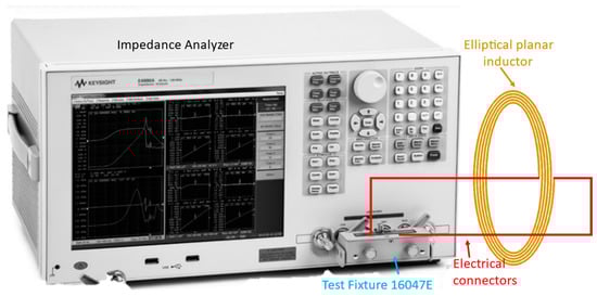To validate the proposed model, a Keysight E4990A impedance analyzer (Keysight Technologies Inc., CA, USA) was used for the measurements of fabricated elliptical inductors. Before the measurements, the impedance analyzer was calibrated using the standard test fixture 16047E (Keysight Technologies Inc., CA, USA) (open and short calibration). The fabricated elliptical planar inductors were connected in this test fixture, as shown in Figure 6, and the inductanceand the real and imaginary parts of the impedance were measured for a range of frequencies between 20 Hz and 120 MHz (the full-scale measurement range of the E4990A). However, to validate the proposed model, the inductance measurements reported in the tables were taken at 1 MHz frequency as the equipment error is only 0.1% at 1 MHz, and it became 5–10% when the measurement frequency is >100 MHz [].