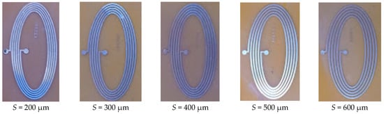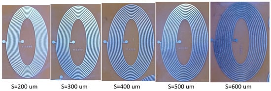 To evaluate the impact of the number of turns of the elliptical inductor on varying trace separation and trace width, five-turn elliptical inductors were investigated. The fabricated elliptical inductors with five turns are shown in Figure 9. For a fair comparison with previous results, trace separation and trace width combinations were kept the same as in the last test setup. The calculated and measured inductance values are tabulated in Table 5 and Table 6, respectively. The maximum value of the calculated inductance was found for a trace width and trace separation of 200 μm, and the minimum inductance value was seen for a trace width of 600 μm and trace separation of 400 μm.